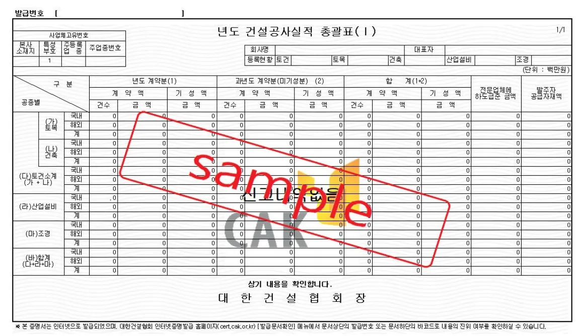 ※ 건설공사실적 총괄표는 ‘대한건설협회’에서 발급한 ‘건설공사실적총괄표 및 기성실적 신고서’ 으로 최근 3년에 대한 서류로 제출 부탁드립니다.