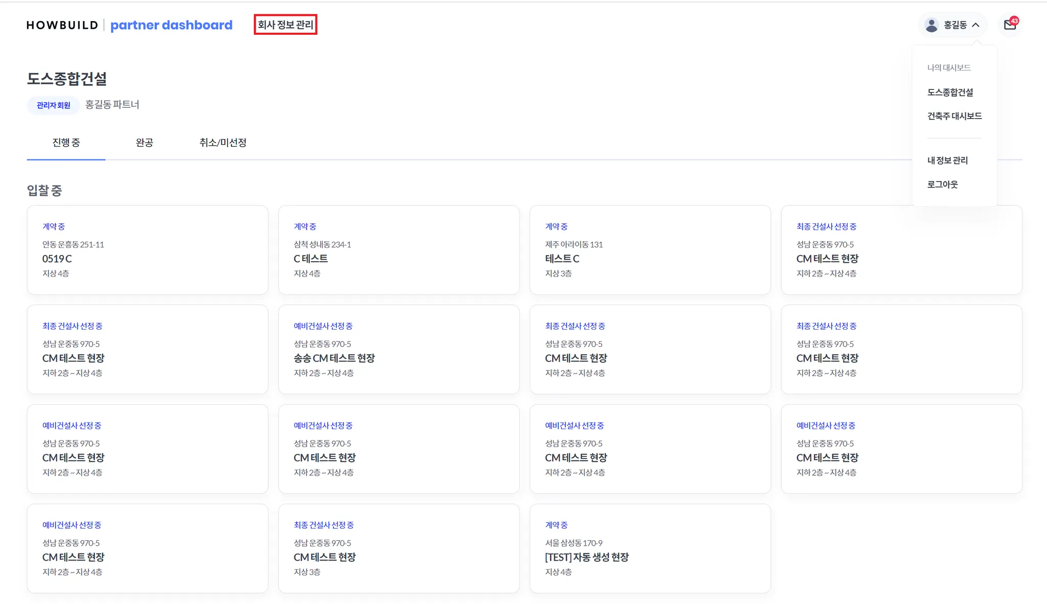 하우빌드 로그인 후 좌측 상단의 회사 정보 관리를