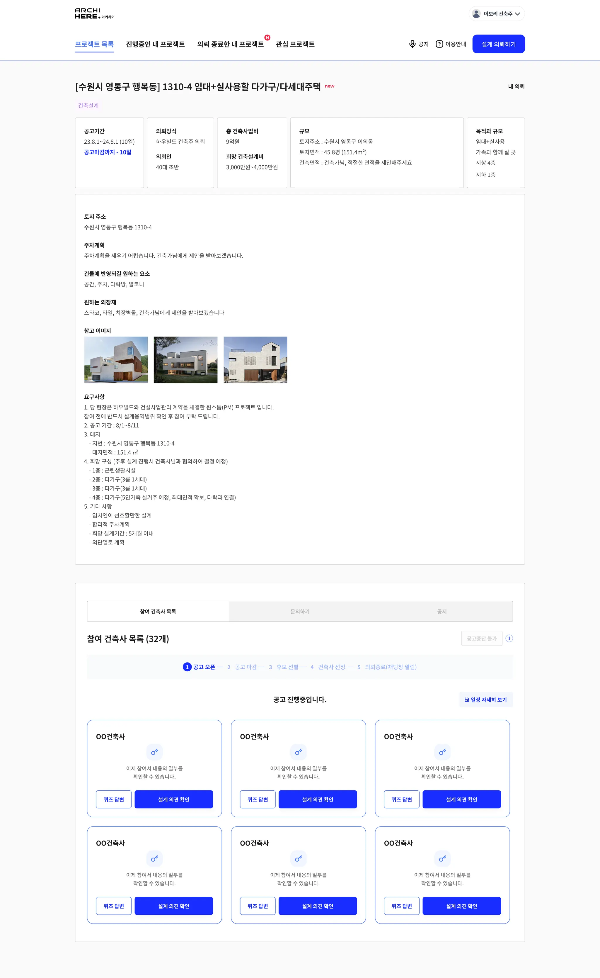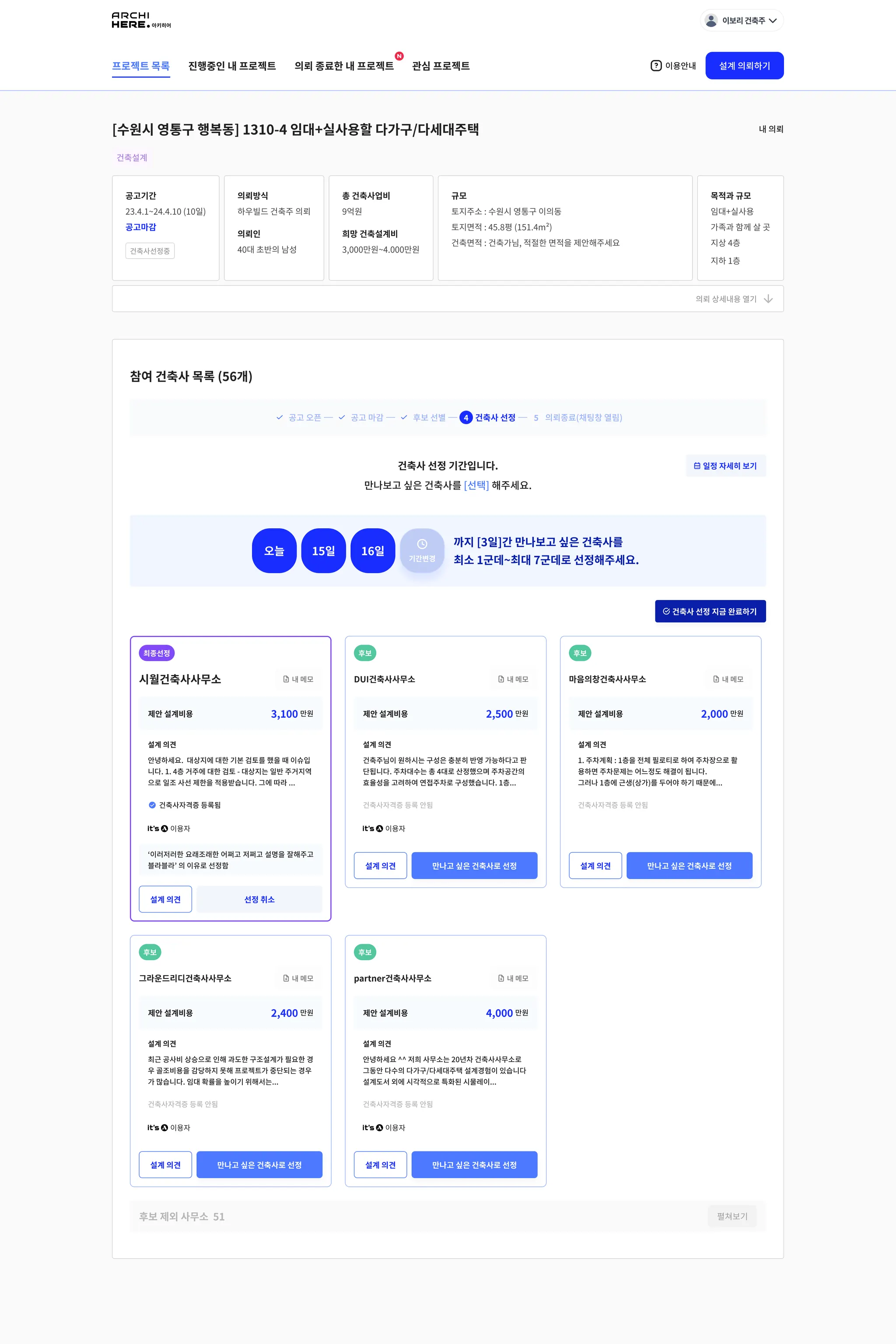 그럼 하우빌드 협력 건축사가 해당 사업정보를 보고, 프로젝트에 참여하게 됩니다. 건축사는 본인의 인사말과 프로젝트에 관한 개괄적인 내용 그리고 제안 설계비를 같이 제출하게 됩니다. 그럼 건축주는 해당 리스트를 토대로 미팅할 건축사를 추려 미팅을 진행하게 됩니다.