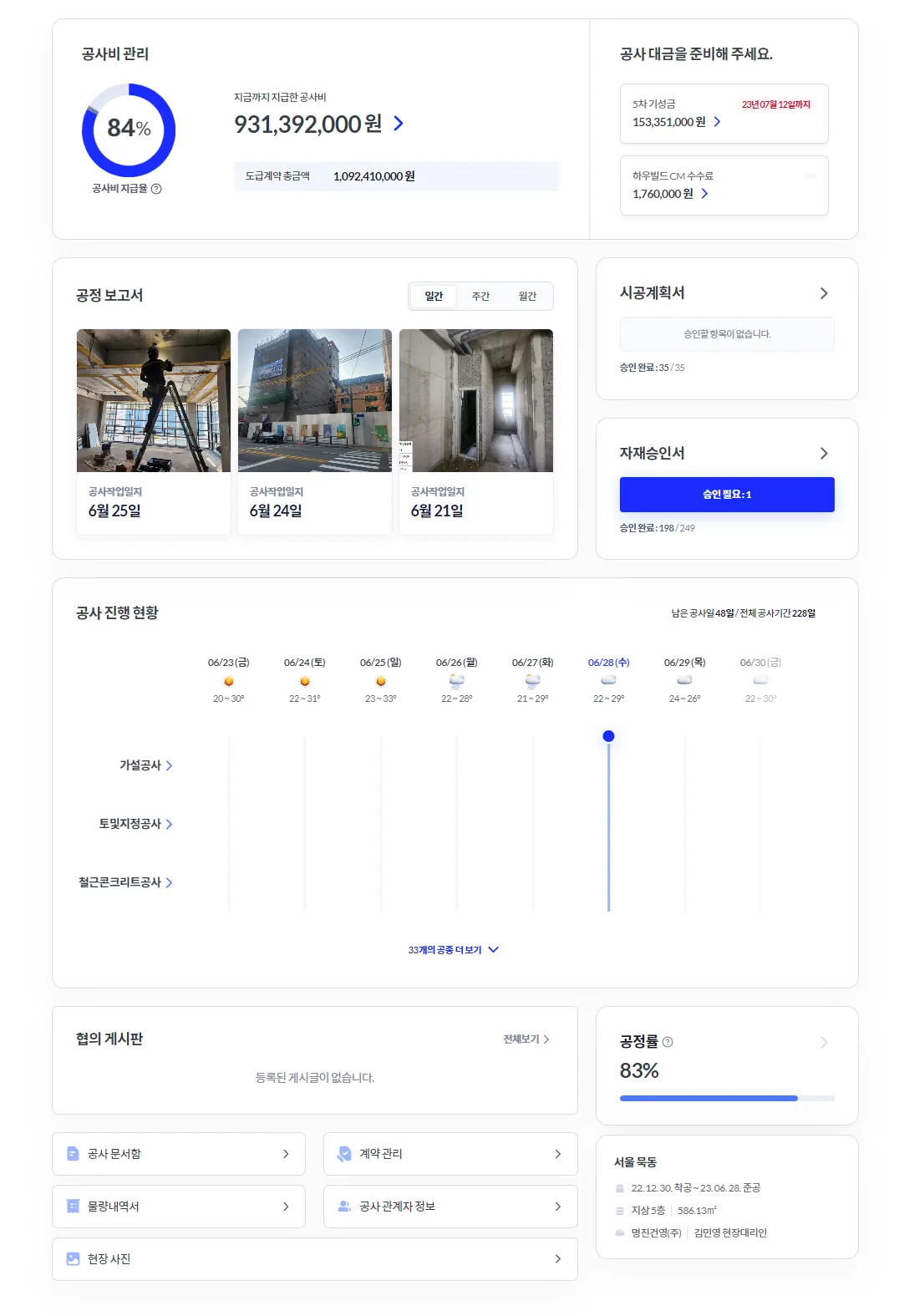 더불어 앞서 건설사가 입력한 내역을 바탕으로 오늘 무슨 작업을 했는지, 내일 무슨 작업을 할건지 등 ‘공정 보고서’를 현장소장이 작성하게 됩니다. 매일 공사진행 상황도 사진으로 찍어 올리게 되죠. 이를 통해 공사가 어느 정도 진행되었는지 공정률도 확인이 가능하며, 추후 공사한 내역 만큼만 공사비가 청구될 수 있도록 합니다.
