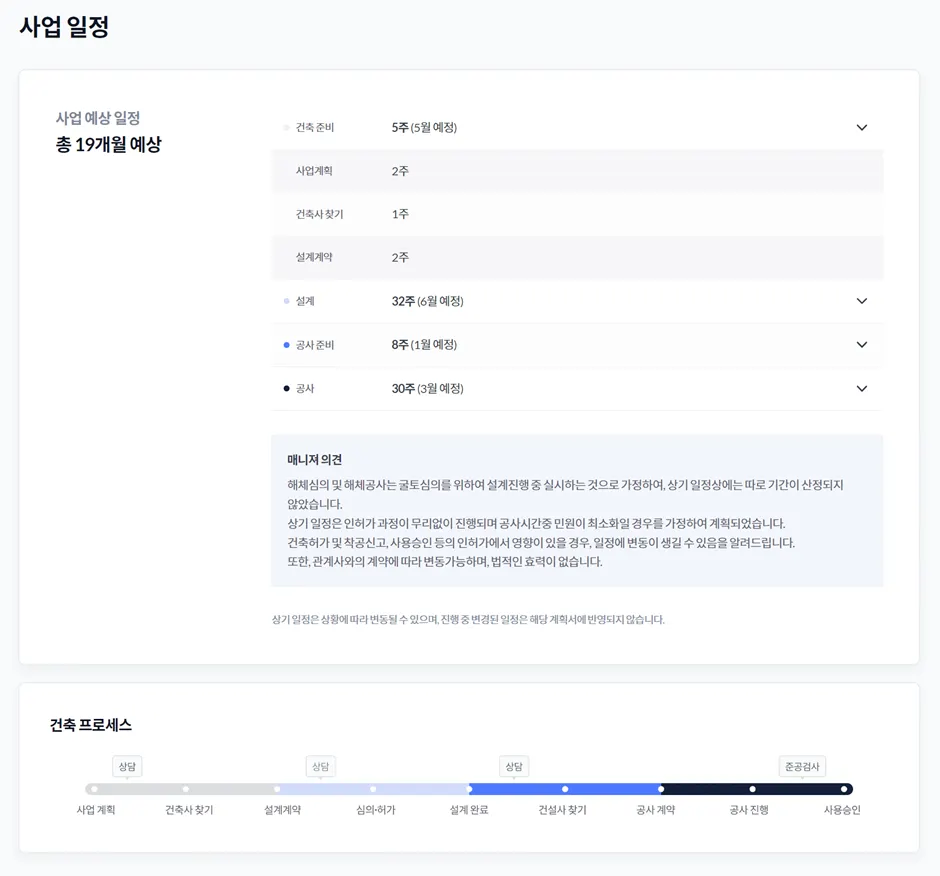 또, 대출과 거의 대부분 함께 하는 건축행위에서 ‘일정’은 가장 중요한 요인 중 하나입니다. 언제 시작해서 언제 끝나는지, 그래야만 지난한 건축과정에서 건축주가 해야할 여러가지 업무들을 적시에 실행하실 수 있습니다.