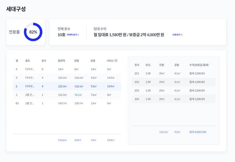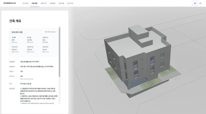 더불어, 상업용 건축을 희망하시는 분들이라면, 수익성과도 가장 밀접하게 연결되어 있는 법적으로 허용하는 유효 임대(혹은 분양)면적 또한 확인하실 수 있습니다. 하우빌드 사업계획서는 예상 가능 규모를 확인하실 수 있도록 건축개요와 층별 면적 구성을 제공하고 있습니다.