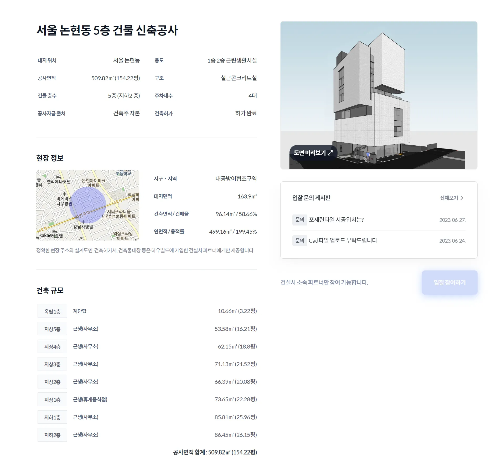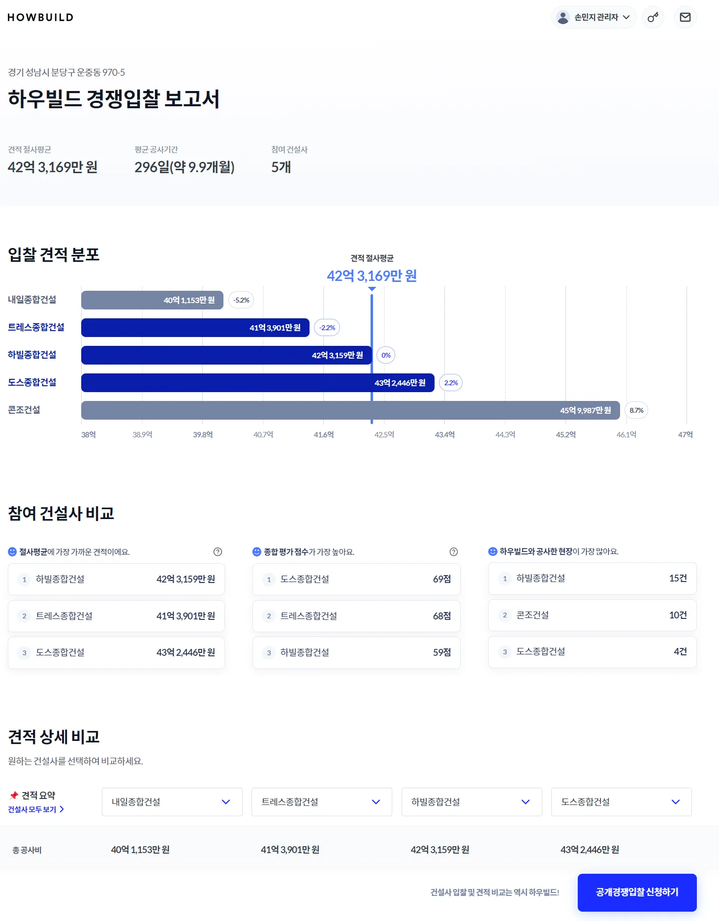 건설사는 하우빌드가 제공한 도면과 내역서를 다운 받게 되고, 이를 토대로 견적을 작성하게 됩니다. 앞서 말씀 드렸듯, 기준은 건설사가 수정하거나 조정할 수 없습니다. 제공된 내역에 ‘가격’만 입력할 수 있기에 추후 동일 기준으로 가격 적정성을 비교할 수 있게 됩니다.