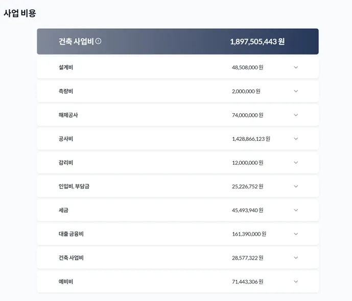 이처럼 하우빌드 사업계획서는 건축사업을 진행하는 데 있어 발생할 수 있는 모든 예상 비용을 산출하고, 계획의 첫 단추인 예산 수립을 하실 수 있도록 도움을 드리고 있습니다. 공사비의 경우 이 만 여 개가 넘는 하우빌드에 축적된 공사비 데이터를 바탕으로 산출되고 있습니다.