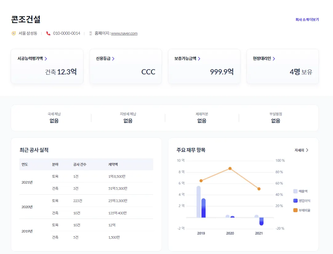 입찰이 마무리되면, 참여 건설사에 관한 업체 정보도 확인이 가능합니다.
