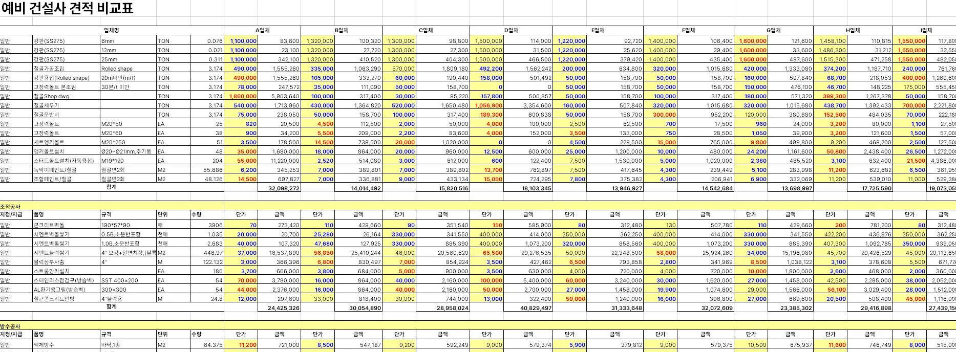 건축은 이미 가격이 정해진 기성품을 구매하는 것과는 다릅니다. 때문에 동일한 설계를 토대로 여러 건설사의 견적을 받는다고 가정할 때, 견적 가격의 근거가 각 건설사 별로 상이하여, 사실상 어떤 것이 맞는 금액인지, 아닌지 확인하기 어렵습니다.
