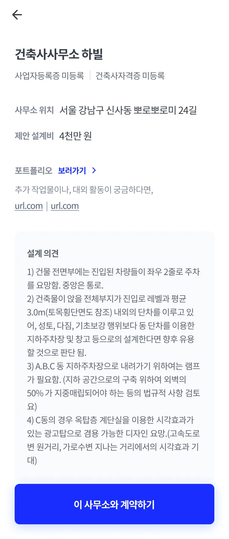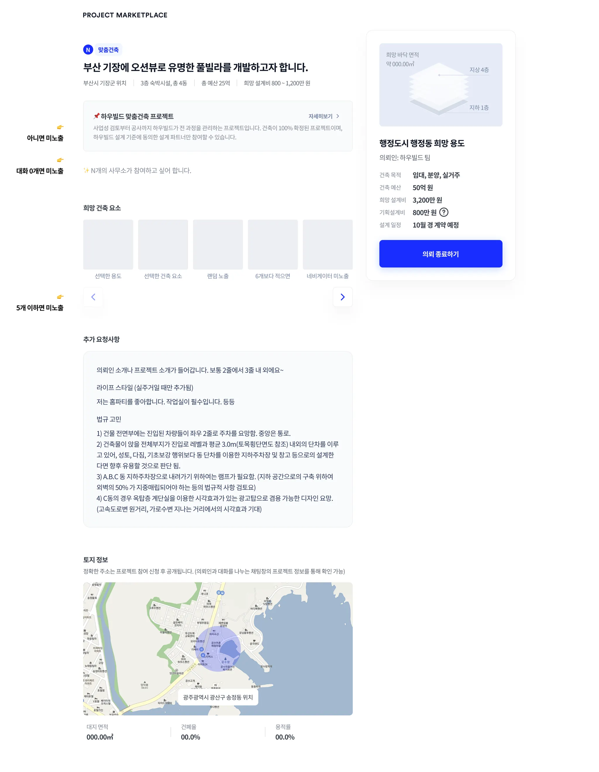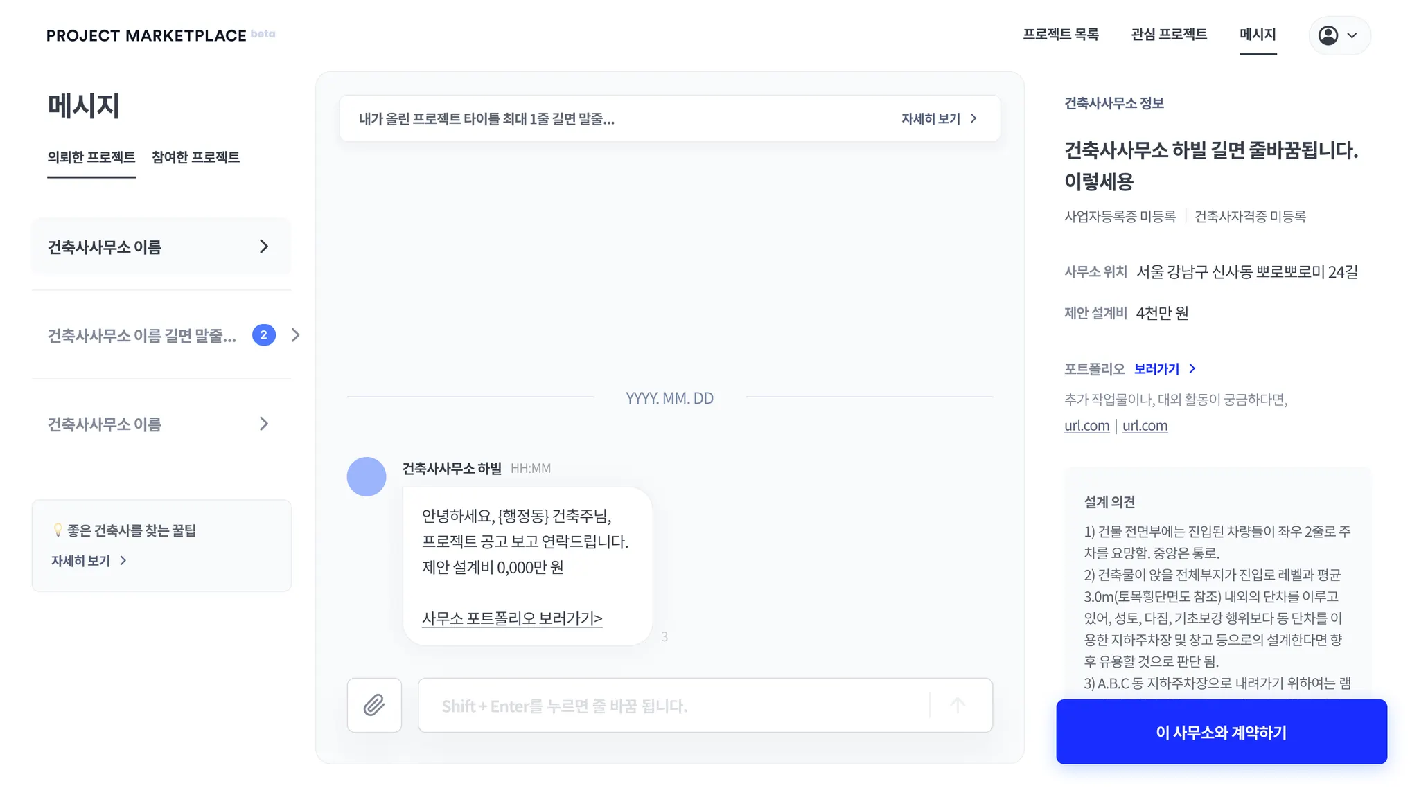 1. 먼저, 마켓플레이스에 프로젝트를 의뢰하고, 참여해주신 건축사님들의 포트폴리오와 설계비용을 비교하고 미팅을 진행해보세요.